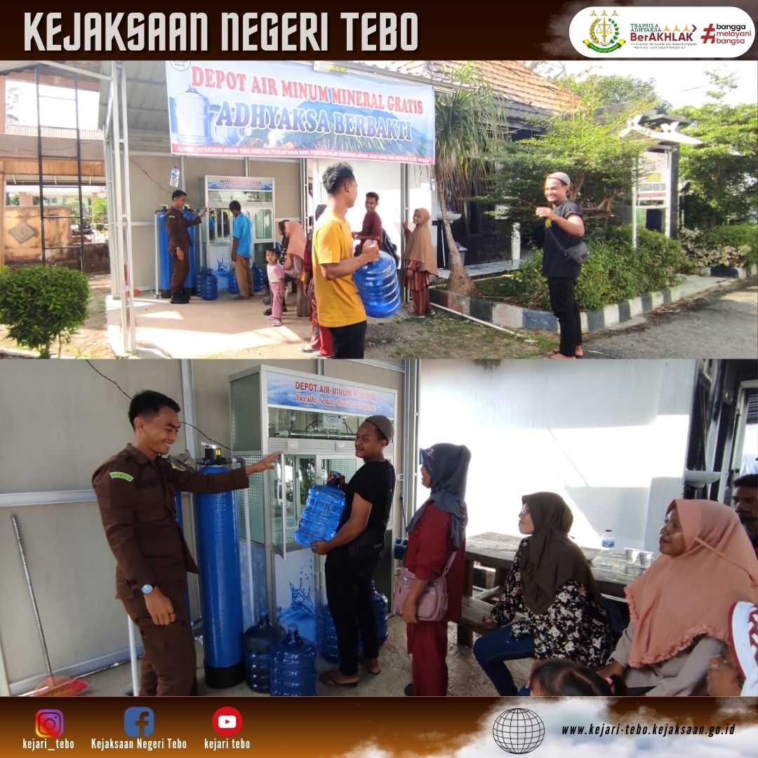 Kejaksaan Negeri Tebo mulai menjalankan Program Adhyaksa Berbakti Depot Air Minum Mineral Gratis yang tersedia pada hari kerja dari pukul 07.00 s/d 16.00 WIB berada di halaman Kantor Kejaksaan Negeri Tebo bagi masyarakat umum di Kabupaten Tebo.