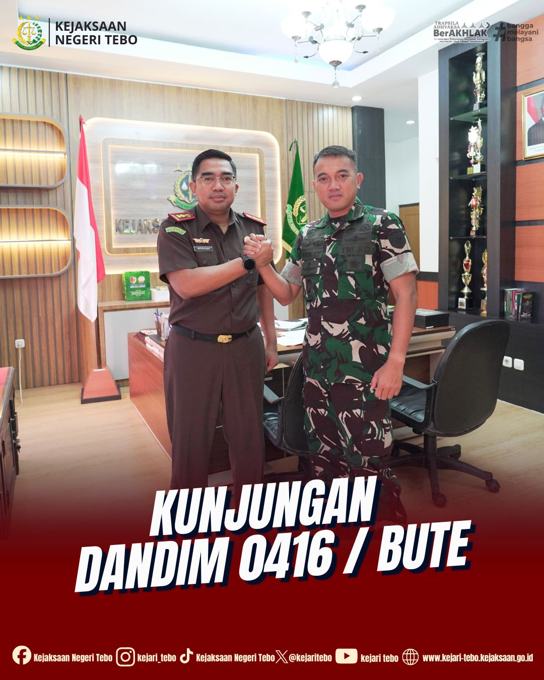 Selasa, 10 Maret 2026 pukul 10.00 WIB, Kepala Kejaksaan Negeri Tebo Dr. Abdurachaman, S.H., M.H. menerima kunjungan silaturahmi dari Komandan Kodim 0416/Bute di Kantor Kejaksaan Negeri Tebo. Kunjungan tersebut berlangsung dalam suasana hangat dan penuh keakraban sebagai bentuk mempererat hubungan kelembagaan serta sinergitas antara Kejaksaan Negeri Tebo dengan jajaran TNI, khususnya Kodim 0416/Bute.