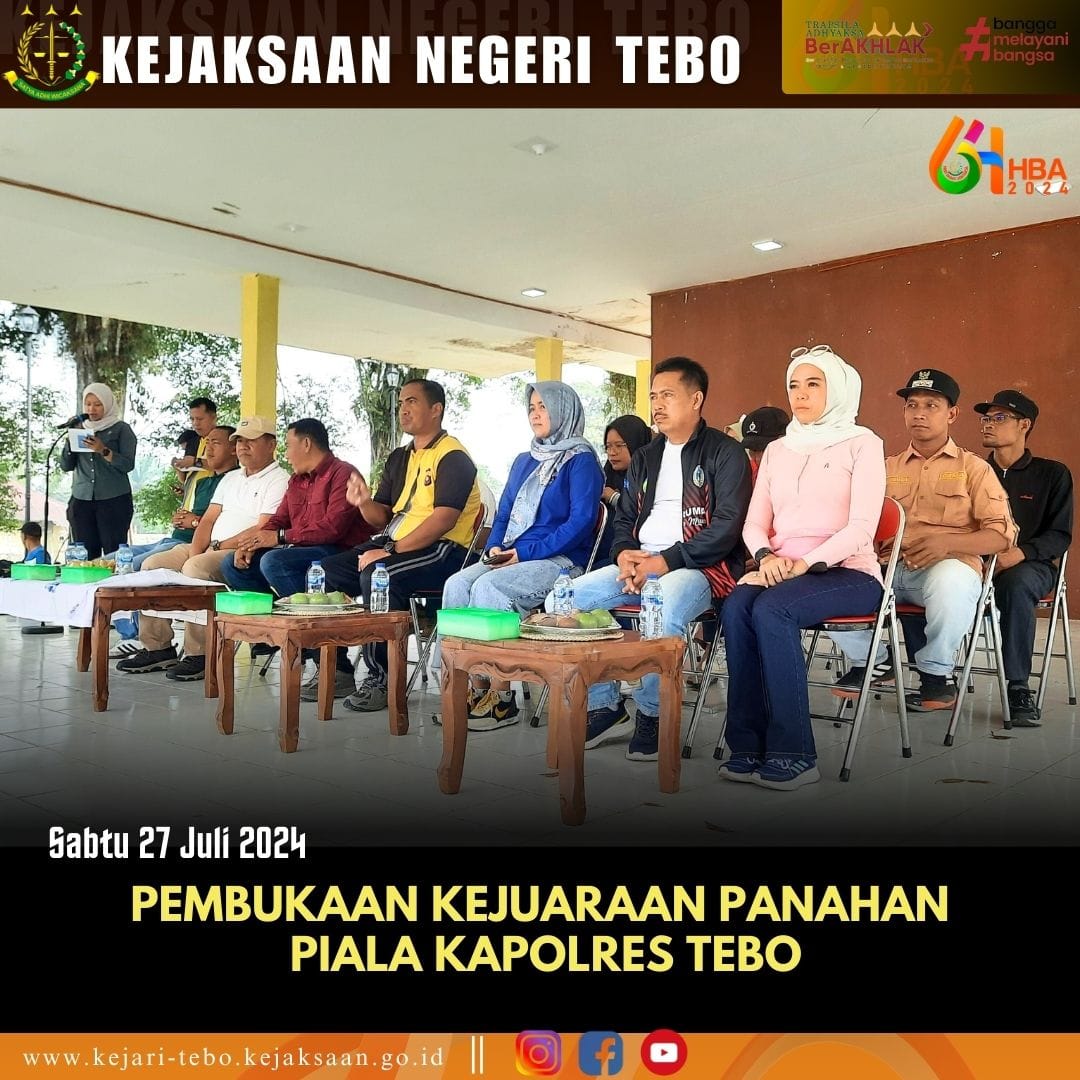 Sabtu, 27 Juli 2024 sekira pukul 09.00 s/d selesai bertempat di Lapangan Merdeka Muara Tebo, Kasubsi Ideologi Politik Pertahanan Keamanan Sosial Budaya Kemasyarakatan Teknologi Informasi Produksi Intelijen dan Penerangan Hukum pada Bidang intelijen Kejaksaan Negeri Tebo Rara Anggaraini, S.H mewakili Kepala Kejaksaan Negeri Tebo menghadiri Acara Pembukaan Kejuaraan Panahan Piala Kapolres Tebo.
