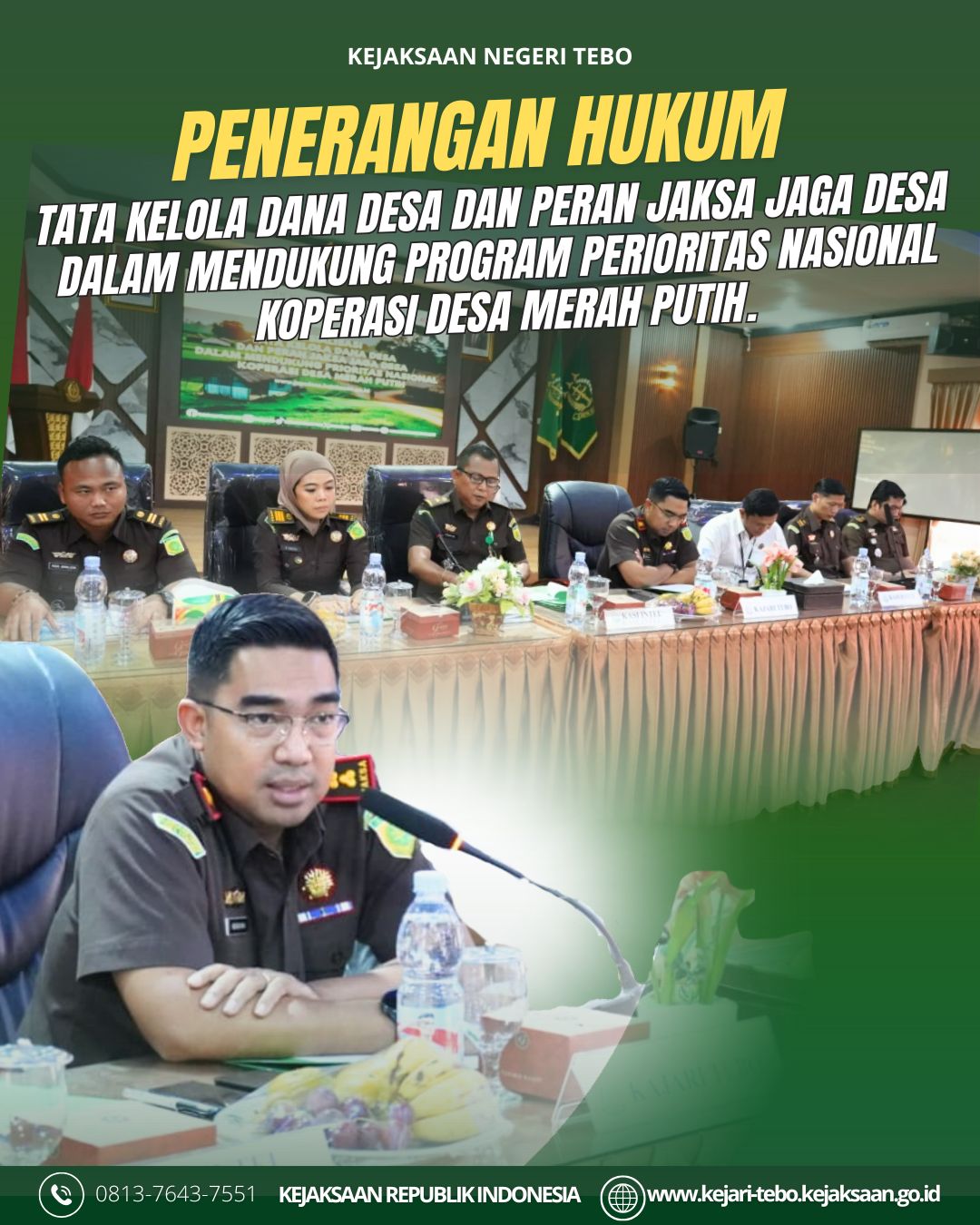 Rabu tanggal 08 Oktober 2025 sekira pukul 10.30 Wib s/d selesai bertempat di Aula Kejaksaan Negeri Tebo telah dilaksanakan Kegiatan Penerangan Hukum Tata Kelola Dana Desa dan Peran Jaksa Jaga Desa dalam Mendukung Program Perioritas Nasional Koperasi Desa merah Putih.