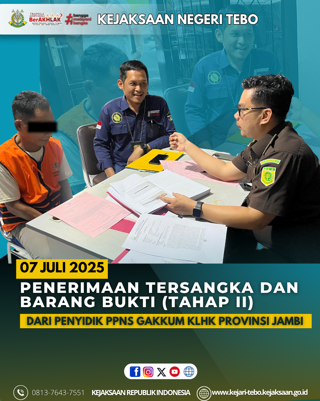 Senin tanggal 7 Juli 2025 sekira pukul 17.00 Wib s/d selesai bertempat di Ruang tahap II Kejaksaan Negeri Tebo telah dilaksanakan Proses penerimaan tersangka dan
