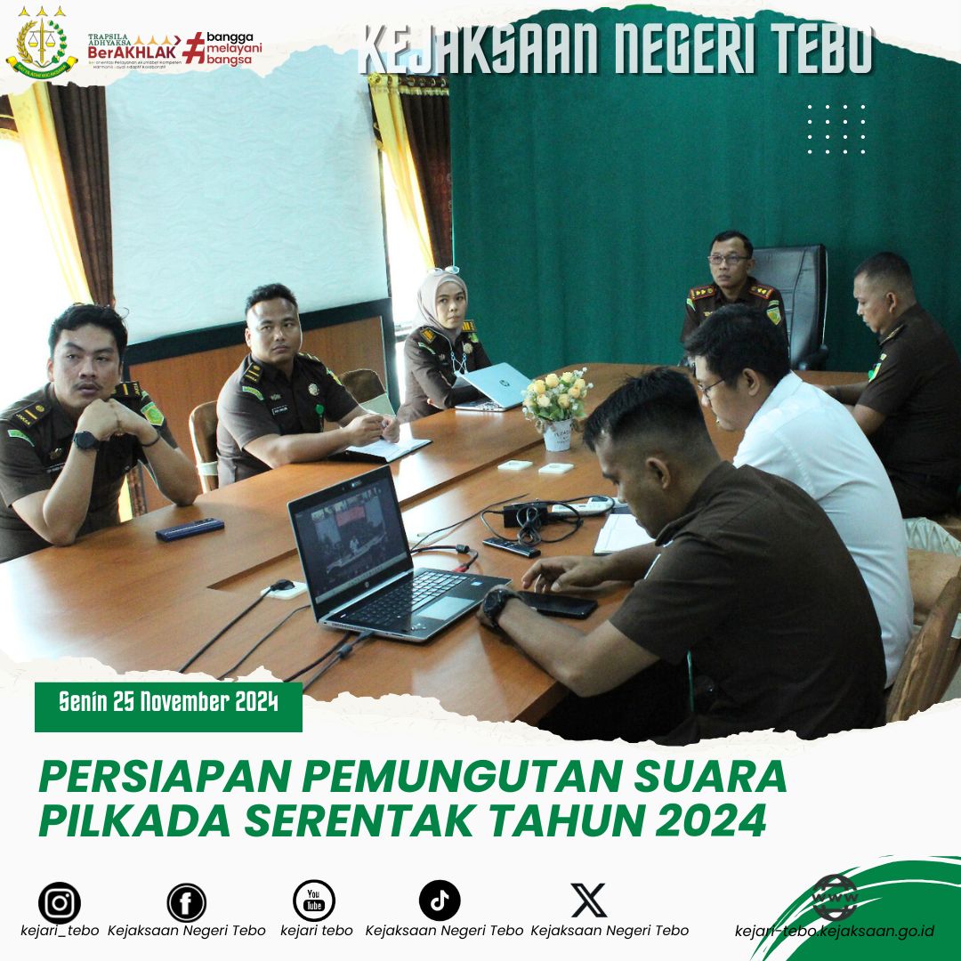 Senin, 25 November 2024 sekira pukul 09.00 Wib s/d selesai, Kepala Kejaksaan Negeri Tebo Bapak Ridwan Ismawanta, S.H.,M.H bersama Jajaran Intelijen mengikuti Pengarahan Jaksa Agung Muda Intelijen dalam rangka Persiapan Pemungutan Suara Pilkada Serentak tahun 2024 secara Virtual yang bertempat di Kantor Kejaksaan Negeri Tebo.
