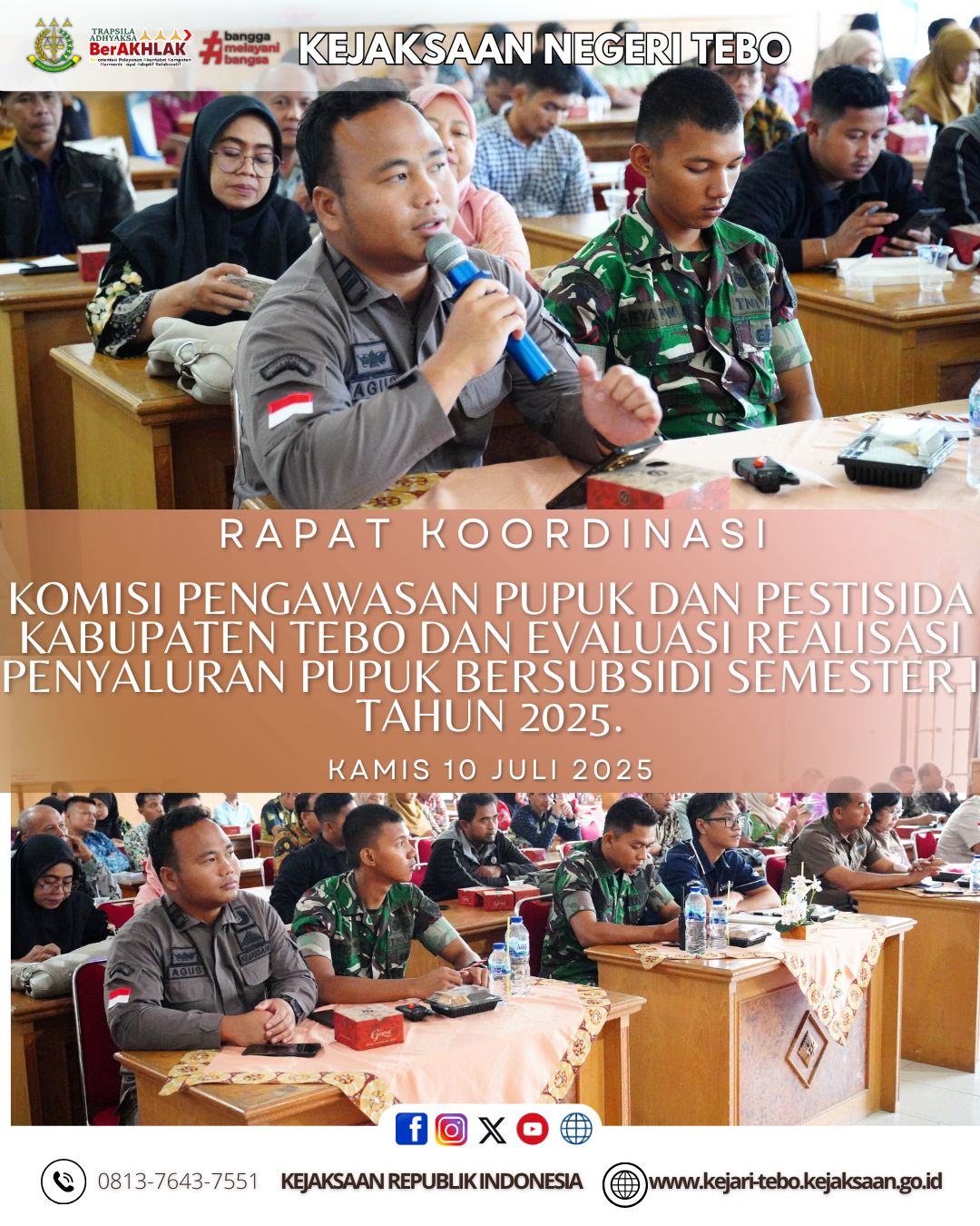 Kamis tanggal 10 Juli 2025 sekira pukul 09.30 Wib s/d selesai bertempat di Aula Melati Sekda Kabupaten Tebo telah diikuti Rapat koordinasi Komisi Pengawasan Pupuk dan Pestisida Kabupaten Tebo dan Evaluasi realisasi penyaluran pupuk bersubsidi semester I tahun 2025.