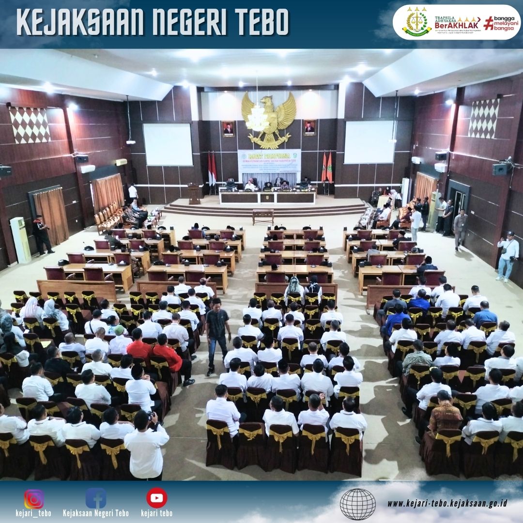 Rabu, 05/06/2024. Kepala Kejaksaan Negeri Tebo Bapak Ridwan Ismawanta, S.H., M.H yang di wakili Oleh Kepala Seksi Perdata dan Tata Usaha Negara Bapak Roniul Mubaroq, S.H., M.H menghadiri Rapat Paripurna DPRD Kabupaten Tebo dalam rangka Penyampaian Pendapat Akhir Fraksi-fraksi DPRD Kabupaten Tebo Terhadap Rancangan peraturan Daerah Kabupaten Tebo tentang pertangungjawaban Pelaksanaan Anggaran Pendapatan dan Belanja Daerah Tahun Anggaran 2023 yang bertempat di Aula Utama DPRD Kabupaten Tebo.