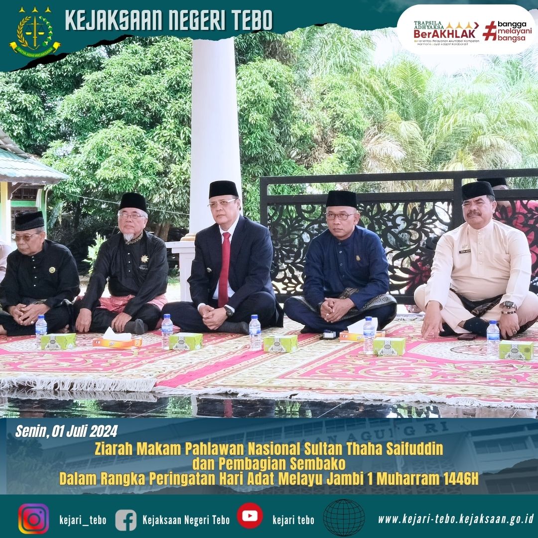 Senin tanggal 01Juli 2024 sekira pukul 09.00 Wib s/d selesai, Kepala Kejaksaan Negeri Tebo Bapak Ridwan Ismawanta, S.H., M.H Menghadiri Ziarah Makam Pahlawan Nasional Sultan Thaha Saifuddin dan Pembagian Sembako Dalam Rangka Peringatan Hari Adat Melayu Jambi 1 Muharram 1446H. yang bertempat di Makam Pahlawan Nasional Sultan Thaha Saifuddin Kabupaten Tebo.